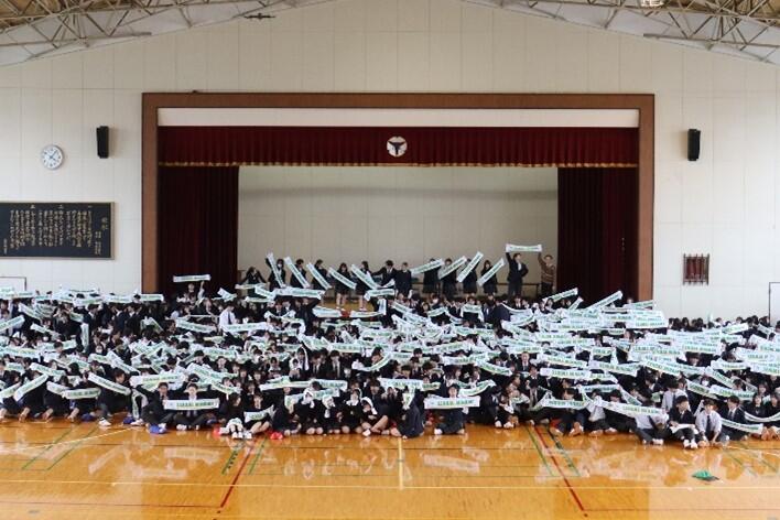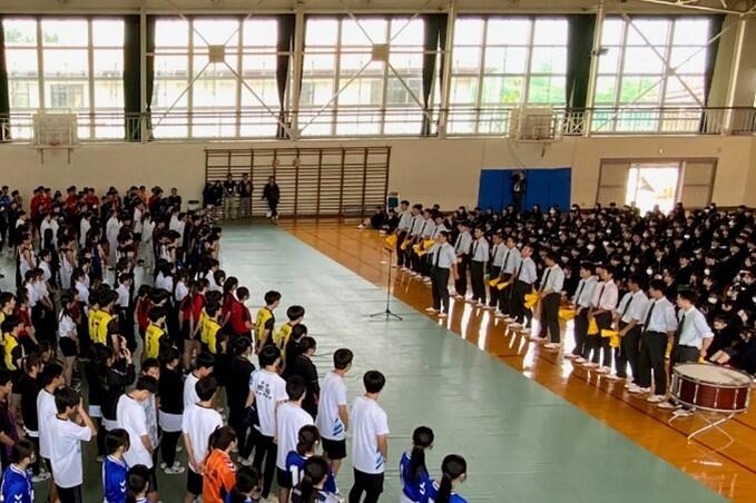 今月から始まる県高校総体にむけて、5月9日(金)5、6校時に壮行式が行われました。吹奏楽部による熱のこもった演奏に彩られながら、ユニフォームに身を包んだ選手たちが入場し、決意表明を行いました。その後、応援団を代表して、野球部がエールを送りました。