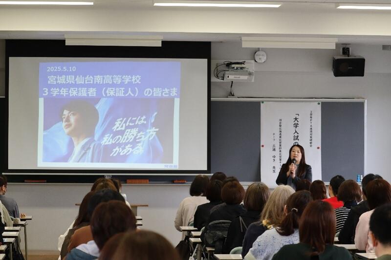 11月20日(木)考査初日の午後、3年生の保護者・保証人を対象とした進路説明会を実施しました。この日は、来校したおよそ200名の保護者・保証人に向け、本校の進路指導部長より「2026年度入試の環境・スケジュール」「併願校を考える」「入試本番までの過ごし方」をテーマとしたお話をさせていただきました。参加した保護者・保証人の方々は約90分の間みな真剣に耳を傾けてくださり、また、説明会終了後も多くの方が残って個別相談を求めるなど、たいへん有意義な説明会となりました。3学年は後期中間考査を終えると、いよいよ受験勉強の大詰めを迎えます。生徒、保護者・保証人、学校が三位一体となって希望進路実現に向け歩みを進めていくうえで、今回の進路説明会はたいへん実り多き時間となりました。