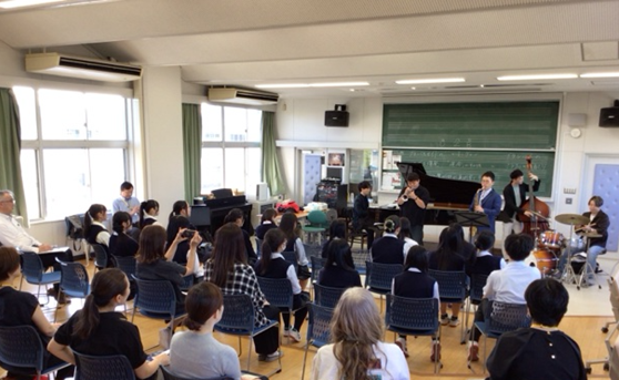 9月26日(金)放課後、音楽室において、若手ジャズグループ「伊達ジャズクインテット」の方々をお迎えし、標記セミナーが行われました。この取組は、昨年に引き続き2度目の開催となります。セミナーでは、プロのミュージシャンの奏でるジャズの調べを堪能した後、ジャズの基本となるリズムやコールアンドレスポンスについてわかりやすくお話をいただきました。生徒が前に出て実際に体験するコーナーも設けられ、セミナーは終始和やかな雰囲気の中で進められました。セミナーの終盤の質疑応答では、活発なやりとりが行われる場面もあり、たいへん濃密で充実した時間となりました。