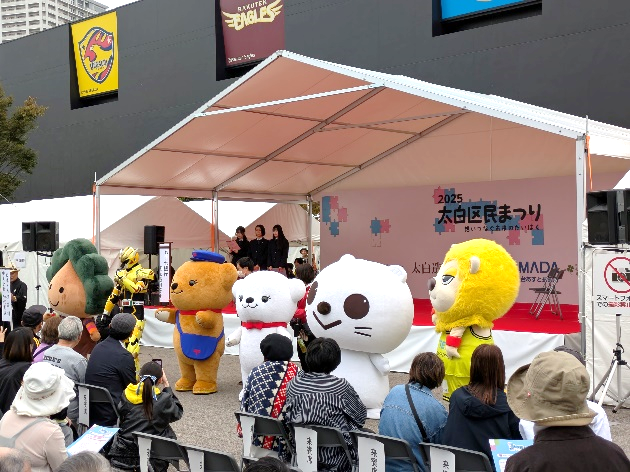 10月19日(日)「太白区民まつり2025ー想いつなぐ未来のたいはくー」(主催:太白区まちづくり推進協議機/太白区)が杜の広場公園特設ステージを会場として開催され、本校放送部のC.Kさん(2年)、S.Nさん(1年)、A.Yさん(1年)の3名が参加しました。Cさんらはこの日、東日本放送のアナウンサーを中心とした総合司会のアシスタントを務め、長町のご当地ヒーロー「ナガマックス」をはじめ、各地域のゆるキャラ、各ステージの出演者の紹介などの業務を担当しました。この「太白区民まつり」は今年で30回目を迎える地域の伝統行事です。この日は特設ステージでの各種発表のほか、テナント村での活動PRや販売、ミニ機関車の運行、はたらく車の展示、プレーパーク開催など、子どもから大人まで楽しめる内容で多いに盛り上がりました。