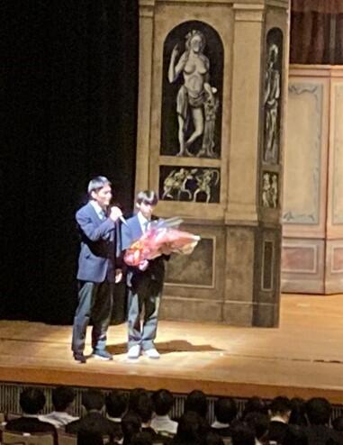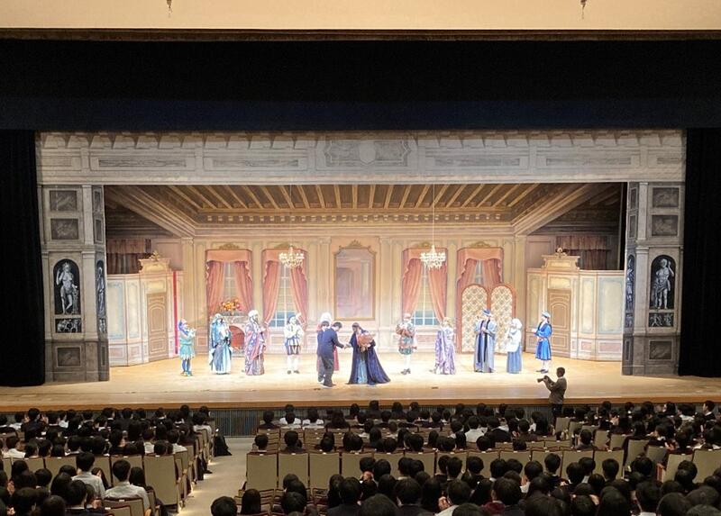10月27日(月)トークネットホール仙台にて、「芸術鑑賞会」が行われました。今年度は、劇団芸優座による演劇「ヴェニスの商人」(W.シェイクスピア著)が上演され、劇団員の皆さんの練りに練り込まれた迫真の演技に魅了されました。閉演後は、図書委員長のS.Rさん(3年)より御礼の挨拶が述べられ、図書副委員長のT.Nさん(3年)より花束が贈られました