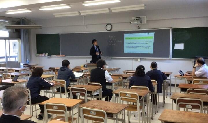 10月17日(金)、本校英語科で、宮城教育大学教職大学院現職派遣2年目の飯塚大樹教諭を講師とし、生徒理解に関する校内研修を実施しました。今回のテーマは「観点別評価」です。生徒目線から見た学習評価の改善、学習評価の実行可能性向上などを話題として掲げ、学習評価について指摘されている課題や学習評価の改善の基本的な方向性、学習評価を行う上での留意事項等について、文部科学省から提示されている内容について改めて確認するとともに、飯塚教諭が現在授業で実際に取り組んでいるパフォーマンステストやルーブルリック評価等の実践報告がなされました。