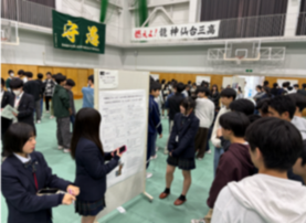 11月6日(木)に行われた仙台三高主催の「イノベーションフェスタ」に、本校2学年課題研究班から3班が参加し、ポスター発表をしました。会場では、校外からの参加ということもあり、多くの三高生や県外の高校の生徒が本校生の発表を聞きに来てくれました。発表に対する質問は基本的なことから発展的なものまで多岐にわたり、参加した本校の生徒たちは、自分の研究をより深く理解するきっかけになったと思います。質問の内容だけでなく、質問の仕方も参考になったようで、自分たちも他の発表を聞くときは、聞き終わった後に質問をしてみようと思ったと話していました。