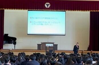 12月23日(火)冬季休業を迎えるにあたっての全校集会が行われました。最初に賞状伝達式が行われ、合唱部や陸上競技部等に賞状が手渡されました。続く校長講話では、熊谷校長より「カロリーメイト」のCM動画が紹介され、同社CM中のフレーズ「うまくいかないとき、それでも続ける努力を底力って言うんだよ」という言葉を引用しながら「部活動で 大学入試の場面で あらゆる場面で みせてやれ底力!」というメッセージが贈られました。最後に、生徒指導部長より休業中の心得についてお話がなされ、校歌斉唱で締めくくられました。