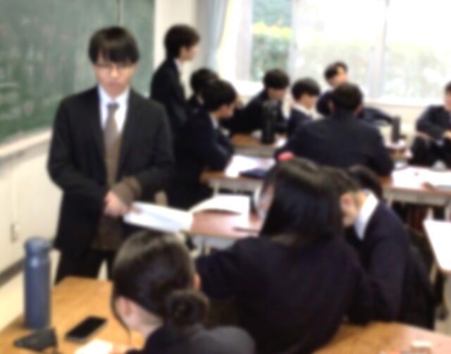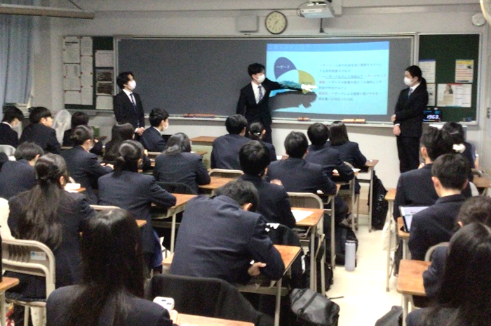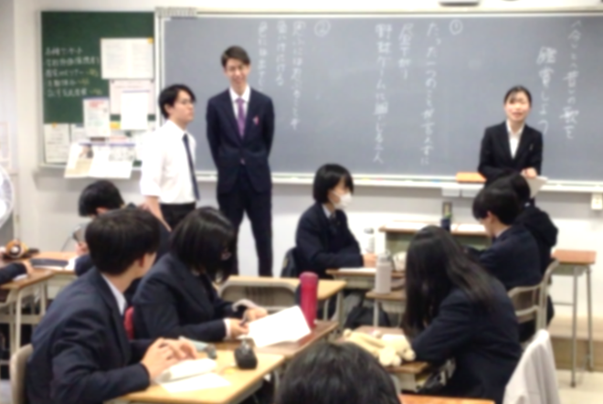 12月3日(水)5・6校時、東北大学の学生・大学院生合わせて49名が来校し、1学年を対象とした「教職実践演習」が行われました。この行事は、東北大学において教職実践課程を履修する学部生・大学院生をお招きし、模擬授業やディスカッション(座談会)をとおして、高校卒業後の将来展望や大学での学びへの理解を深めるとともに、進路意識の高揚を図ることをねらいとしたものです。この日は、各クラスで全14講座の模擬授業が行われ、聴講した生徒たちは大学での学びの一端を知るとともに、学問に対する視野を広げることができました。座談会では、受験勉強や大学での研究、大学生活の状況など、幅広い話題について活発な質疑応答がなされ、様々なヒントを得るとともに、互いの交流が深められました。