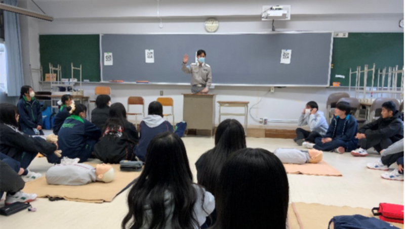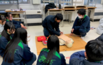 12月25日(木)の午後に、仙台市太白消防署八木山支所の職員の方々をお招きして、救急救命に関する研修会を行いました。各部活動からの代表生徒と教職員あわせて約40名が参加しました。心肺蘇生の流れを一人ひとりが体験し、部活動中に想定される事故や、通報時のスマホの活用の仕方、汗や湿布がある場合のAEDの使い方のポイントなど、具体的な場面を想定しながら学ぶことができました。
