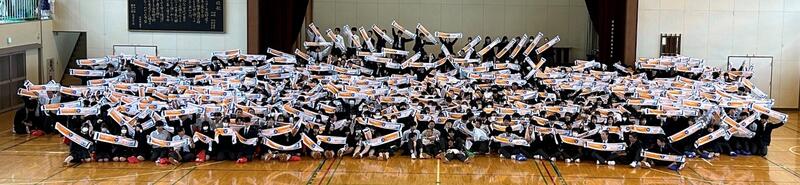 *同窓会から寄贈された『南高タオル』を全校生徒全員で掲げ、写真を撮りました。
