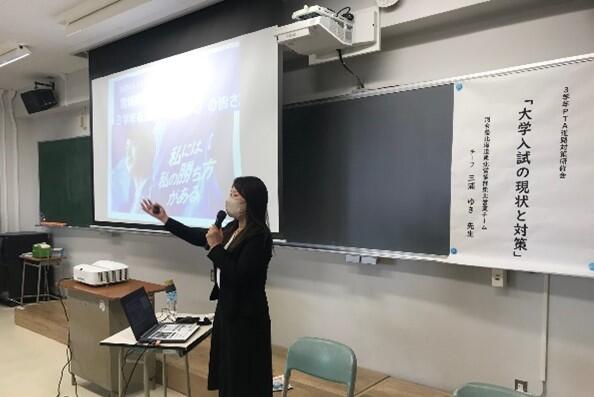 5月11日(土)、河合塾東北営業部より三浦ゆき様を講師としてお迎えし、「3学年保護者・保証人対象PTA進路対策研修会」を実施しました。三浦様からは、「大学入試を取り巻く環境」「大学入試の基礎知識」「受験や大学生活にかかる費用」「保護者の心構え」など、これから本格的に受験期を迎えるにあたり、保護者・保証人の皆様に知っておいていただきたい内容についてお話をいただきました。