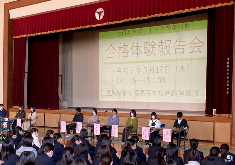 9月22日(木)、昨年度の入試で現役合格を果たした本校卒業生5名を講師としてお迎えし、「1・2学年対象 合格体験報告会」を実施しました。この日お越しいただいた先輩方は、現在、東北大学教育学部、宮城教育大学教育学部、山形大学理学部、福島大学人文社会学群、東北学院大学教養学部に通う大学1年生です。先輩方からは、志望理由や志望校決定の時期、学習面における努力、スマホとの付き合い方、後輩たちに伝えたいこと等について、現役時代のご自身の経験をもとにした具体的なアドバイスをいただきました。50分という短い時間でしたが、参加した生徒たちはみな先輩のお話に真剣に耳を傾け、熱心にメモを取るなど、意欲を持って臨んでいました。事後アンケートには「先輩方のお話を聞いて受験勉強をするにあたっての心構えなど、よく考えることができた」「いつからどう勉強していたのかなど、普段の学校生活では知ることのできない内容だった」「これからの受験を見据えた生活の仕方を考える機会になった。受験は人生の終点ではなく通過点だと再認識できて、受験への気持ちが少し軽くなった」などの言葉が見られました。お忙しい中、ご協力いただいた卒業生の皆様には改めて感謝申し上げます。(進路指導部)