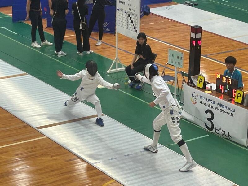 本校フェンシング部のK.Kさん(3年)が、8月4日より鳥取県案来市で開催された「開け未来の扉 中国総体2025」(インターハイ)のフェンシング競技に出場しました。結果は、プール戦3勝2敗でトーナメント戦に進出、2回戦まで進み、ベスト32でした。応援ありがとうございました。