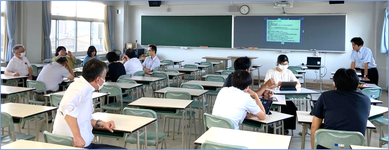9月4日(水)合同講義室にて、主幹教諭をファシリテーターとし、第2回目となる校内の「教員勉強会」を実施しました。今回のテーマは「観点別学習評価」です。観点別学習評価とは、「知識・技能」「思考力・判断力・表現力」「学びに向かう力」の3つの観点に沿って生徒の学習状況を評価する仕組みです。指導と評価の一体化を図り、「教師が指導を改善すること」「生徒自身が学習を振り返り、次の学習に向かえるようにすること」を目的とした評価方法です。高等学校では、学習指導要領の改訂に伴い、2022年より導入されました。今回の勉強会では、参加した教員がグループになり、ロイロノートを活用しながら、現在の評価システムの課題や問題点について共有するとともに、観点別評価を行うにあたっての問題点や疑問点等について意見交換をしました。