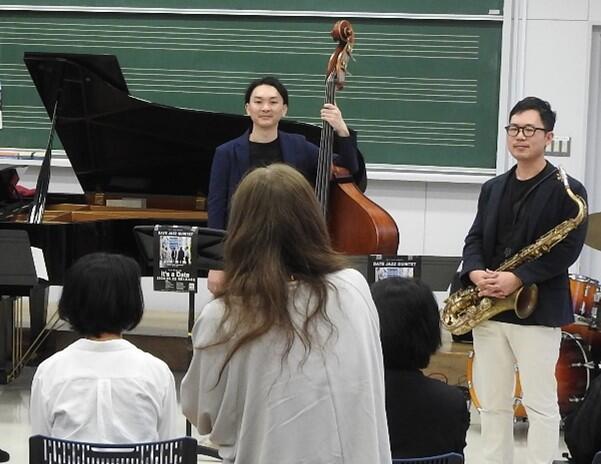 10月16日(水)、PTA1・2・3学年セミナーとPTA健全育成委員会行事の合同企画として、「伊達 ジャズ クインテット」の皆さんをお迎えし、本校音楽室にてジャズコンサートが行われました。16:00からの第1部と17:20からの第2部という2部構成で、保護者・生徒・教員合わせて約60名が参加しました。ジャズの名曲や校歌のジャズバージョンの演奏をしていただき、演奏後には参加者からの質問にもお答えいただきました。間近で聴く生の演奏は、とても迫力がありました。